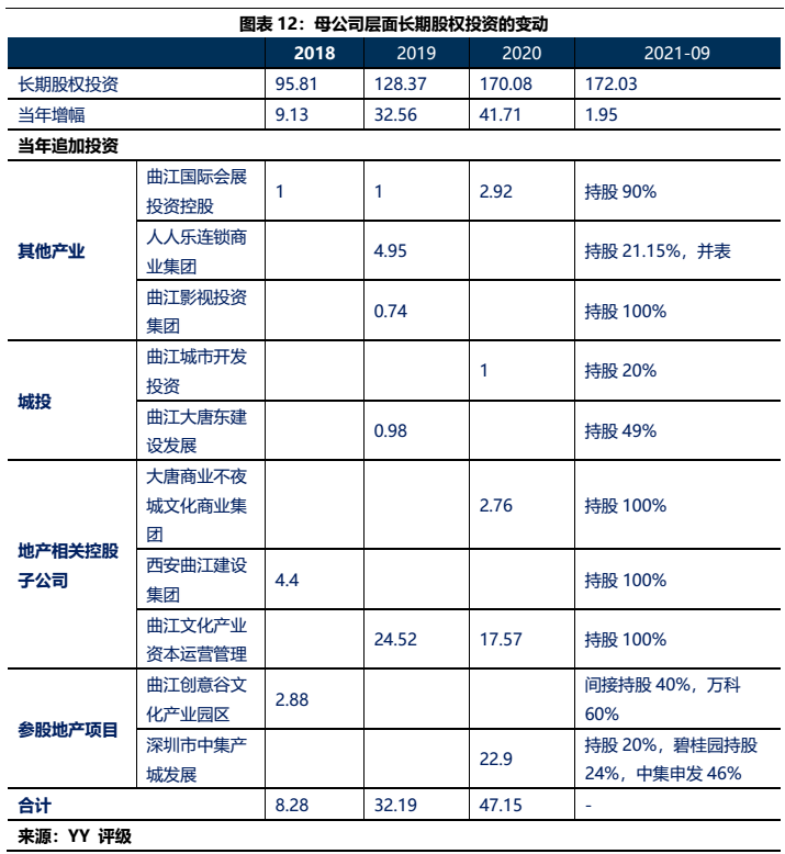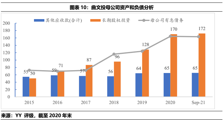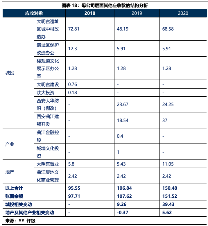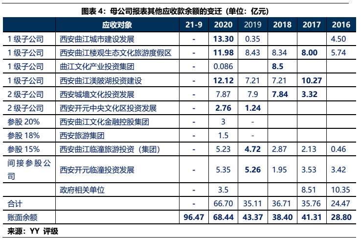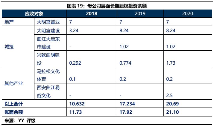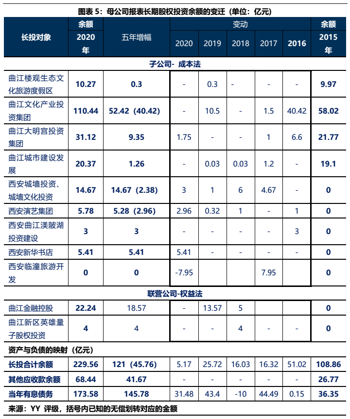 1)本部5年內的資金沉淀,主要以應收款和長投注資的形式沉淀于三大發債主體(曲文投、大明宮投資和西安城墻合計應收11億,長投增加35億),文旅類主體(樓觀道建設、臨潼旅游和渼陂湖建合計應收34億),文化主體(西安演藝和新華書店合計收購7.8億),基建(曲江城市建設應收13億)以及產業控(曲江金控注資6.57億,英雄量子股權投資注資4億)等。
