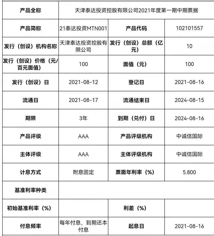 2021年8月16日,天津泰達投資控股有限公司發行的“21泰達控股MTN001”正式起息。
