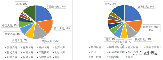 截止2018年底,臺灣地區(qū)一共有55家保險公司,其中再保險公司3家、壽險公司29家、財險公司23家。從保費收入來看國泰人壽、新光人壽、富邦人壽、南山人壽、臺灣地區(qū)人壽這前五大壽險公司占據(jù)了70%的市場份額,其中有4家為金控集團旗下壽險品牌,而市占率不到百分之一的壽險有9家。財險方面,富邦、國泰世紀和新光三家金控集團下的財險公司占據(jù)了整個市場的46.98%。