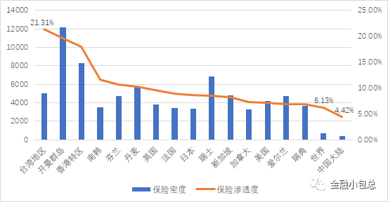 圖四:世界主要國家和地區(qū)的保險密度和滲透度