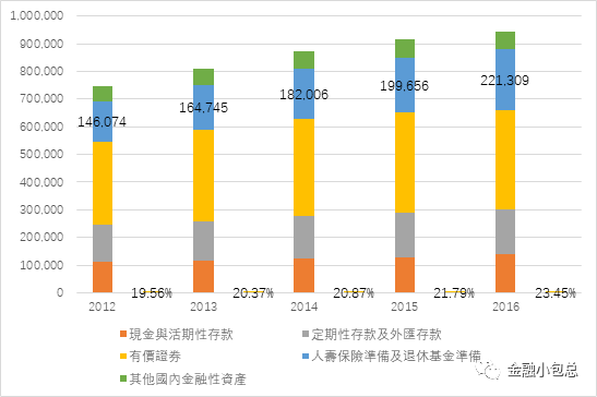 此外,臺灣地區(qū)稅法賦予年金險每人每年24000新臺幣的稅費減免也促進了保險產(chǎn)品的發(fā)展。目前保險產(chǎn)品已經(jīng)成為臺灣地區(qū)家庭部門資產(chǎn)配置的主要組成部分,長期維持在24%上下。