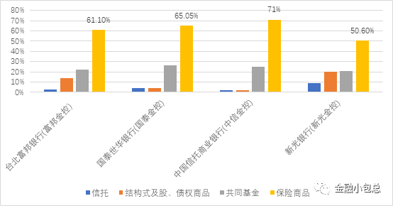 臺灣地區(qū)金融機構(gòu)目前以“金控”體系為主,一個金控集團旗下囊括了銀行、保險、證券期貨和基金公司。金控體系下各個金融子板塊之間往往從考核機制上被要求要相互協(xié)作,因而金控下的銀行財富管理部門有意識引導(dǎo)民眾購買保單。