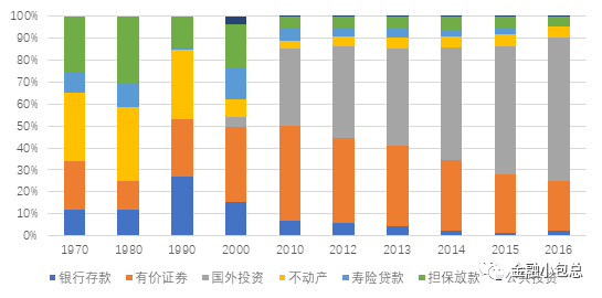 上世紀90年代之后,隨著臺灣地區(qū)經(jīng)濟從中高速步入低速經(jīng)濟增長,本土制造業(yè)受累于成本高企而大量外遷,臺灣地區(qū)本土的各類資產(chǎn)投資收益率逐年走低(參見圖十四:國泰人壽各類資產(chǎn)資金運用的收益率走勢),保險業(yè)者紛紛要求主管部門放開境外投資的上限,境外投資占臺灣地區(qū)保險業(yè)投資的比重逐年上升。
