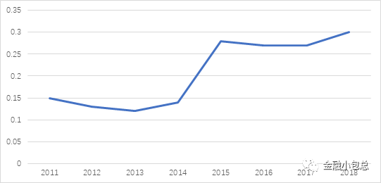 圖三:臺灣地區(qū)保險業(yè)資產(chǎn)規(guī)模占金融機構(gòu)總資產(chǎn)比趨勢
