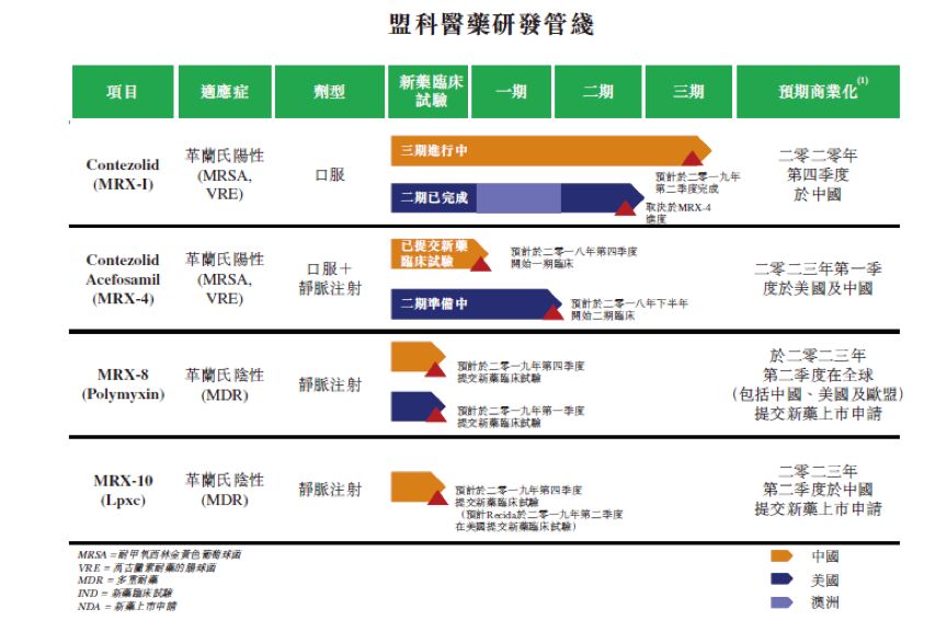 盟科醫(yī)藥是以研發(fā)多重耐藥即超級細(xì)菌感染的抗菌藥為主。公司的在研項目只有4個,其中主要產(chǎn)品有治療革蘭氏陽性多重耐藥菌感染的contezolid(MRX-I)以及contezolid acefosail(MRX-4)。公司研發(fā)最快的項目MRX-I預(yù)計最快2020年年底在國內(nèi)上市。