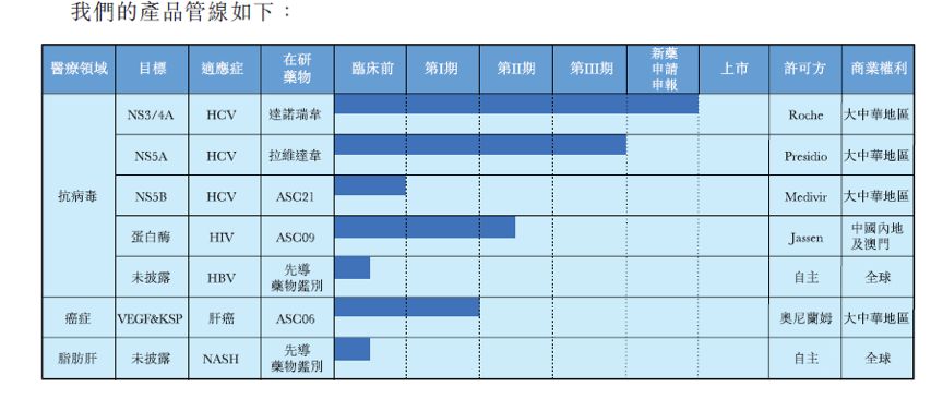 公司的核心產(chǎn)品包括戈諾衛(wèi)(達(dá)諾瑞韋)、拉維達(dá)韋、ASC09以及ASC06。目前中國食品藥品監(jiān)管總局于2018年6月8日授出有關(guān)戈諾衛(wèi)的新藥申請批準(zhǔn),并在國內(nèi)開始將戈諾衛(wèi)進(jìn)行商業(yè)化。以下是公司7個在研藥品的研發(fā)進(jìn)度。