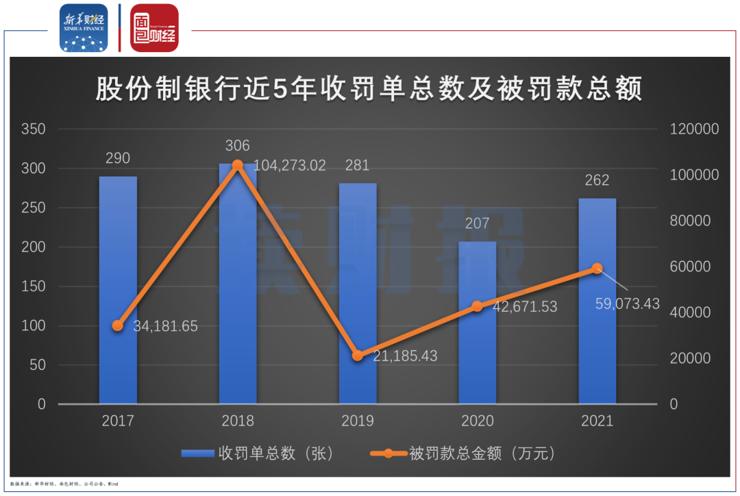2021年(以處罰日計)涉及股份制上市銀行的機構罰單總數為262張,較上年增加55張,增幅達26.57%;被罰款總金額約5.91億元,較上年增加1.64億元,增幅達38.44%。
