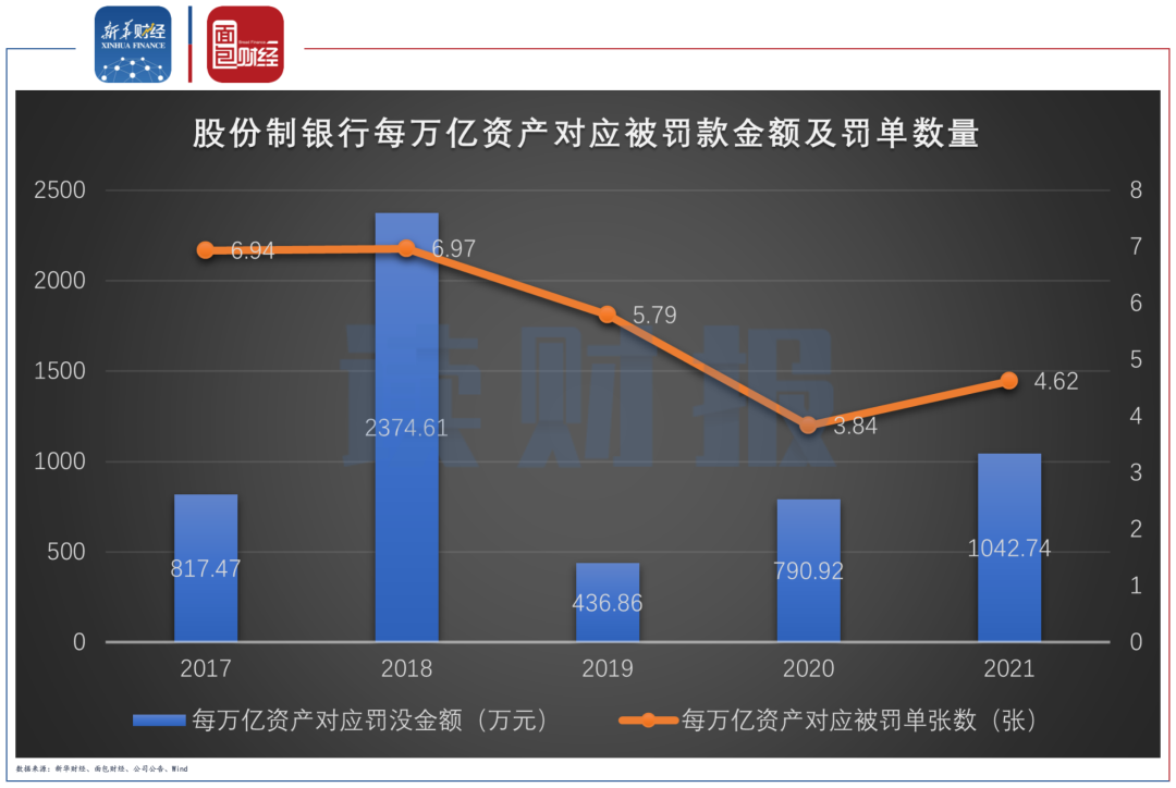 以每萬億資產對應的收罰單數及被罰款金額來計算,2021年股份制銀行的收罰單張數及被罰款金額也呈增長趨勢。