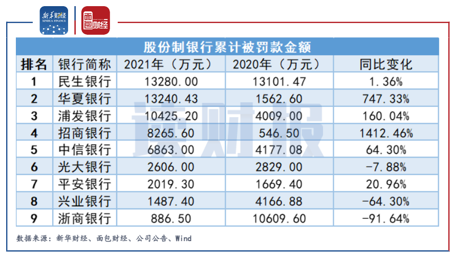 從被罰金額來看,2021年民生銀行、華夏銀行及浦發銀行的累計被罰金額均過億元。