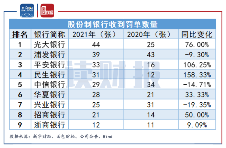 分項統計顯示,2021年,光大銀行收罰單總數最多,民生銀行被罰總金額最高,招商銀行被罰款金額增速居首。