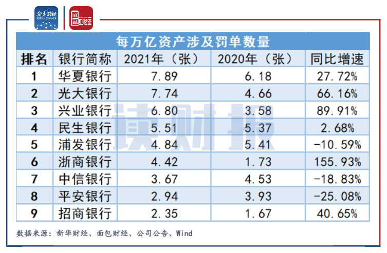 以每萬億資產涉及罰單數進行統計,2021年華夏銀行每萬億資產對應罰單數為7.89張,數量居首;光大銀行為7.74張,排在第二位;興業銀行所對應的罰單數為6.8張,排在第三位。