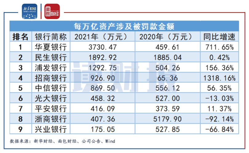 單位資產視角:華夏銀行收罰單數量及被罰款金額均居首位