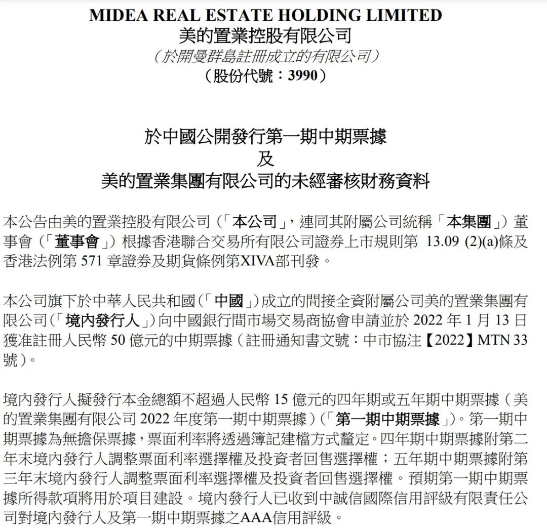 就在被報道接盤正榮天津某項目差不多同一時間,美的置業發布公告,稱擬通過間接全資附屬公司美的置業集團有限公司發行不超過人民幣15億元中期票據。預期第一期中期票據所得款項將用于項目建設。
