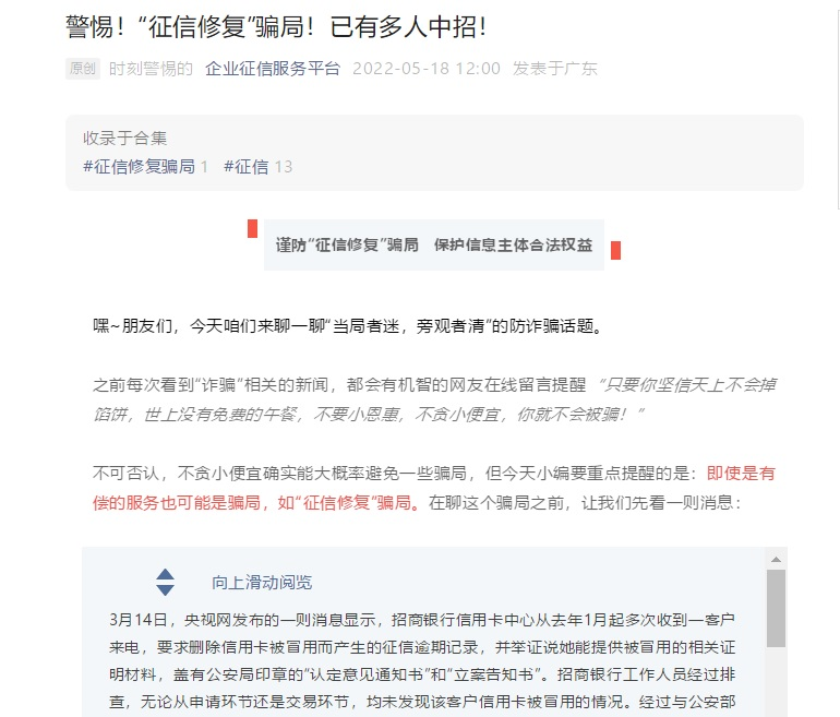 今兒微眾信科的朋友發來一條他們平臺的最新推送《警惕“征信修復”騙局,已有多人中招》,讓我們也給擴散擴散。其實這事兒,央行包括其多地分行通過他們的宣傳平臺,已經三令五聲敲過警鐘;但另一頭也是魔高一尺,“征信修復”黑灰產已經以完整產業鏈的形式開枝散葉,從營銷、培訓、到加盟、代理,形成了一批有組織的團伙。