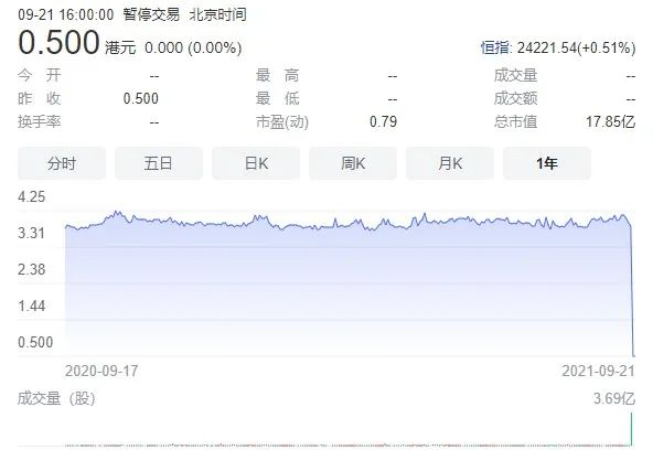 跌得實在是不行了,最低曾至0.37港元/股,跌幅超90%,最終以發(fā)布“短暫停牌”公告暫時緩解。