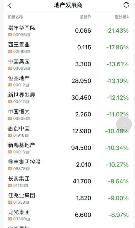 此前,中國基金報整理了,香港本地地產(chǎn)股集體大跌。恒基地產(chǎn)、新世界發(fā)展、嘉里建設(shè)跌超10%,長實集團、新鴻基地產(chǎn)跌超9%,龍光集團、綠景中國地產(chǎn)、富力地產(chǎn)跌超8%,雅居樂跌超7%。
