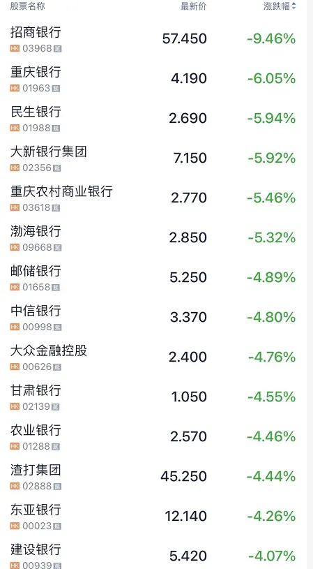 招商銀行跌幅超9%,中國平安繼續(xù)慘。