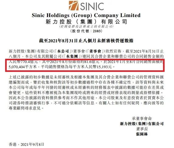 日前,新力控股集團公布的最新銷售情況看,前8月新力控股實現(xiàn)合同銷售金額約770.4億元,對應(yīng)銷售面積為507.04萬平米,平均銷售價為15193元/平米。