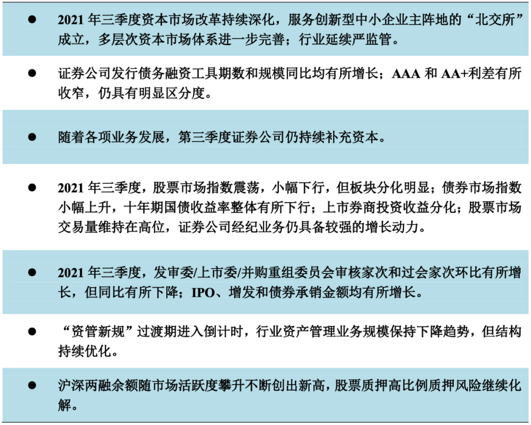 2021年三季度,國內股票市場行情波動加大,呈結構性行情,但股票市場交易量維持在高位,兩融業務實現較好發展;投資銀行類項目過會率環比有所下降,IPO、增發和債券承銷金額同比均有所增長;資產管理業務結構持續優化,股票質押業務風險逐步化解。