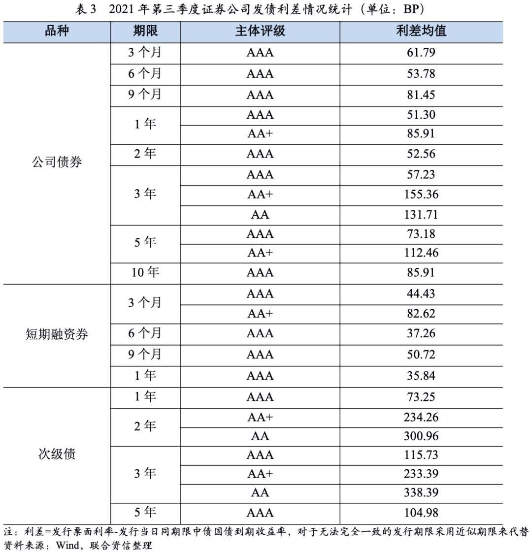 2021年第三季度,證券公司發行利差均值68.34BP,較二季度下降10.99個BP。證券公司發行不同債券品種在不同主體評級和不同期限上均具有明顯區分度,AAA主體發行利率顯著低于AA+級證券公司,AAA級證券公司發行1年期和3年期公司債券利差均值在50.30BP和57.23BP,遠低于AA+證券公司發行同等期限公司債券利率,AA+與AA級券商發行3年期公司債券利差呈與評級等級倒掛狀態,主要系AA級證券公司3年期公司債券具有擔保所致。AA+證券公司發行的5年期公司債券利差略低于同評級下的3年期公司債券,但考慮到三季度內AA+證券公司僅發行了二期5年期限的公司債,該數據沒有可比性。AAA證券公司發行3個月期限短期融資券利差均值在44.43BP,AA+證券公司為82.62BP。AAA證券公司發行各年期次級債利差均低于AA+及AA級證券公司發行同期限的次級債券利差。綜上所述,AAA證券公司在融資成本方面優勢明顯。