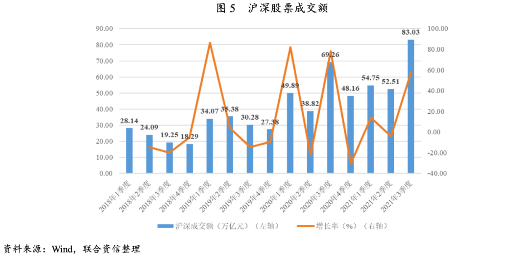 自2020年三季度股市交易活躍程度達到階段性峰值以來,股市交易的活躍程度有所下降,但一直維持在歷史的相對高位,滬深兩市成交額基本穩定在50萬億元規模上下。2021年三季度,滬深兩市成交量83.03萬億元,環比增長58.12%,同比增長19.88%;市場交投活躍程度大幅攀升,滬深兩市成交額創歷史新高,整體看,經紀業務具備較強增長動力,有力支撐證券公司收入增長。