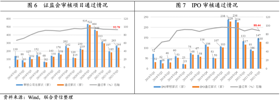 2021年三季度,發審委/上市委/并購重組委員會審核項目總家次及通過家次分別為263家和244家,分別為二季度的1.34倍和1.32倍;其中IPO審核家次及過會家次分別為147家和130家,通過率為88.44%,環比下降4.03個百分點。隨著注冊制的落地,發審委/上市委/并購重組委員會審核項目數量在2020年下半年達到峰值,雖然2021年三季度的審核及通過項目數量較二季度大幅增加,但較上年同期仍有所減少。