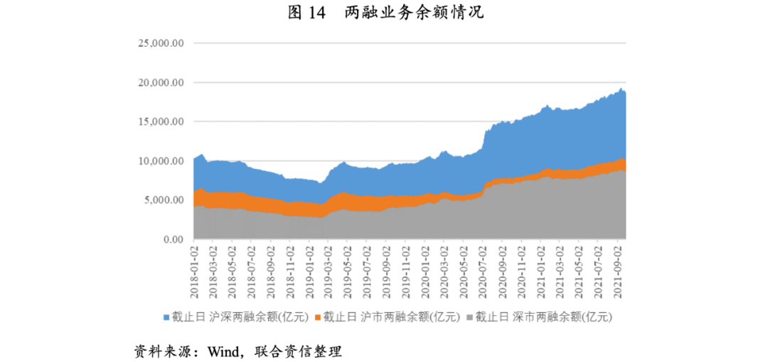 2021年三季度,滬深兩融余額隨市場活躍度攀升不斷創出新高。2020年至今,證券市場持續回暖,滬深兩市兩融余額呈增長態勢。2021年一季度,滬深指數有所調整,兩融余額在1月達到階段性高點17156.53億元后有所回落;2021年二、三季度,隨著市場活躍度的攀升,兩融余額不斷創出新高。截至2021年9月末,滬深兩市兩融余額18415.25億元,較上季度末增長3.21%。