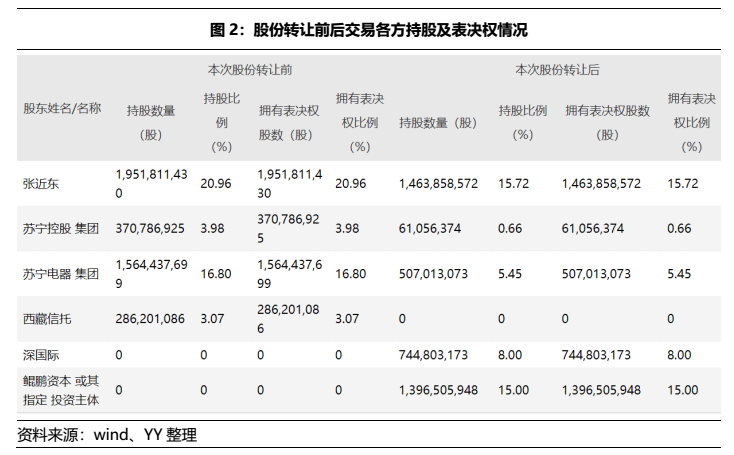 本次交易完成后,上市公司原控股股東、實控人張近東及其一致行動人蘇寧控股集團持股比例將降至16.38%,蘇寧電器集團持股比例降至5.45%,鯤鵬資本持股比例為15%,深國際持股比例為8%,張近東仍為蘇寧易購的第一大表決權股東。