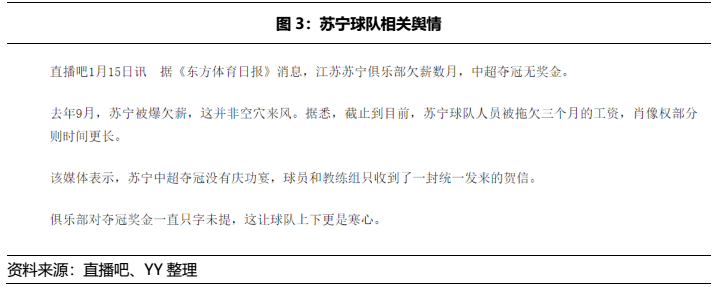 同天,蘇寧球隊發布了停運的公告,追溯1月的輿情可以發現,之前蘇寧球隊就爆出欠薪三個月的消息,也印證了之前整個蘇寧系流動性的緊缺,另外此番剝離球隊,也有回歸主業,剝離無關副業的決心。