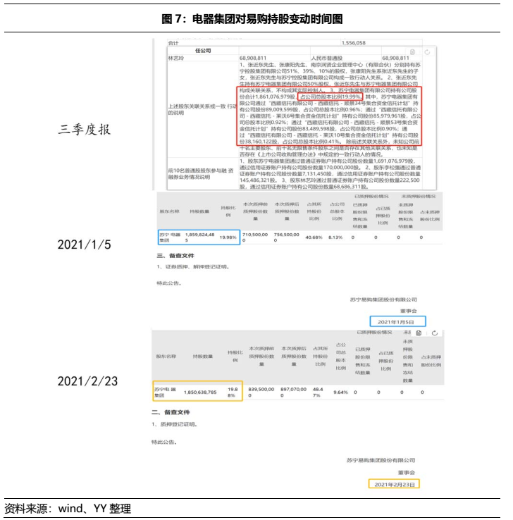 從時間線及主體來看,2021年以來電器集團共質押了近5.63億股,張近東共質押了1.12億股,主要用于補充質押和融資相關。截至2021年2月23日,蘇寧電器集團持有公司19.88%的股份,共計質押8.97億股,占所持股份的48.47%;截至2021年2月3日,張近東及一致行動人蘇寧控股集團有限公司合計持有公司24.94%股份,共計質押4.11億股,占所持股份的17.72%。