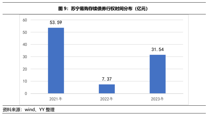 截至2021年3月1日,蘇寧易購存續債券12只共計92.13億元,其中包含4只ABS共計33.54億元。按行權時間統計,最近一只是即將在4月19日到期的 “18蘇寧01”,余額13.32億元。從時間段來看,2021年需行權53.59億元,2022年面臨7億元的行權壓力(為19云智優),2023年需行權31.54億元(包括15.924億元的20云享A、6.635億元的20云享B、3.981億元的20云享C)。