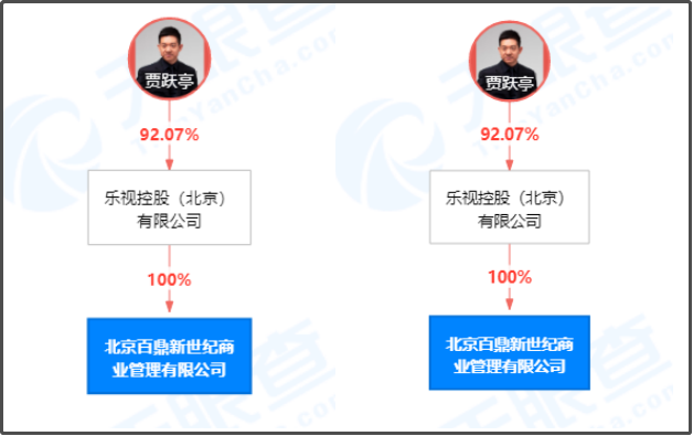 據天眼查顯示,北京財富時代置業有限公司注冊資本10.1億人民幣,由樂視控股(北京)有限公司100%控股,法定代表人為吳孟;北京百鼎新世紀商業管理有限公司注冊資本3000萬人民幣,由樂視控股(北京)有限公司100%控股,法定代表人為吳孟。賈躍亭持有樂視控股(北京)有限公司92.07%的股權,賈躍亭為兩家公司的最終受益人。