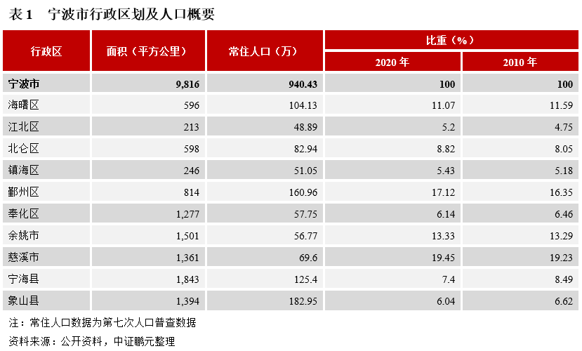(1)行政區劃:寧波是副省級市,區域陸域總面積9,816平方公里,海岸線總長1,678公里。下轄6個區、2個縣,同時代管2個縣級市。2020年“七普”數據顯示,寧波市常住人口為940.43萬人,相較2010年增加179.86萬人,是浙江省人口第三大城市,次于杭州的1,193.60萬人和溫州的957.29萬人;同時,受益于發達的經濟發展水平、旺盛的發展活力和友好的落戶政策,寧波近年來始終保持著較強的人口吸引力,2020年實現人口凈流入約86.2萬。