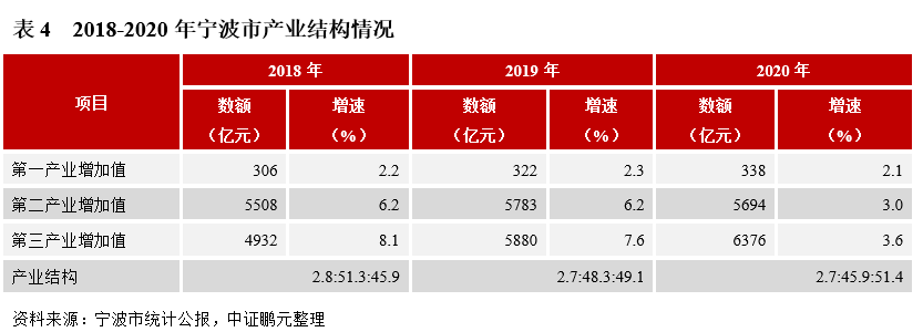 寧波市是典型的外向型民營經濟驅動型城市,以汽車制造業、電氣機械和器材制造業、化工、紡織等為支柱產業。同時,近年來寧波市加快經濟轉型升級,發展起了以港口物流、文化旅游等為主的現代服務業,受益于此2020年寧波市第三產業占比首次提升至50%以上(見表4)。