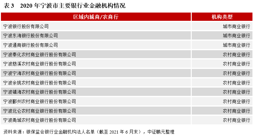 (5)金融發展:活躍發達的民營經濟利好寧波的金融發展, 2020年末寧波金融機構人民幣各項存款余額23,166.7億元,同比增長14.2%;人民幣各項貸款余額25,052.0億元,同比增長15.1%。截至2021年6月末,寧波市共有城商行3家、農商行8家(見表3),同時還有1家農村信用社(象山縣農村信用合作聯社)、12家村鎮銀行(余姚通濟村鎮銀行股份有限公司、寧波市海曙國民村鎮銀行有限責任公司、寧波慈溪中銀富登村鎮銀行有限責任公司等),為當地企業、居民提供了有效的融資渠道和便捷的金融服務,其中部分銀行已在政策扶持之下逐漸將業務拓展至全國范圍。