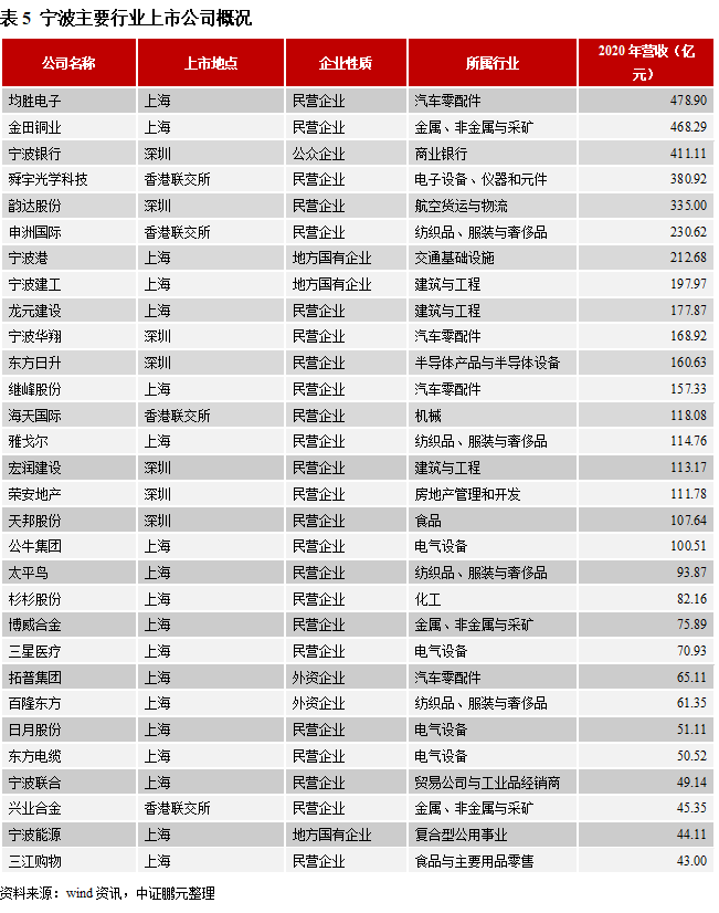 工業方面:2018-2020年寧波市規上工業增加值分別增長6.3%、6.4%和5.2%,疫情對寧波工業企業擾動有限,這受益于政府為復工復產創造的良好條件和企業自身較強的韌性。主要行業中,增加值總量排名前三的汽車制造業、電氣機械和器材制造業、化學原料和化學制品制造業增加值同比增長6.2%、4.1%、7.6%。工業經濟效益層面,寧波2020年規上工業整體表現出較強韌性,營業收入同比增長0.7%,利潤總額、利稅總額分別實現同比增長17.7%、11.4%,且利潤、利稅的總量均位居全省首位。細分行業里,汽車制造業、化學原料和化學制品制造業盈利能力較強,利潤總額分別為459億元、208.9億元,同比增長44.7%和17.2%。外貿方面,2020年全年寧波出口總額同比增長7.3%,全年實現進出口額9,786.9億元,超過廣州排名全國第6,這主要得益于兩個方面的原因:一是疫情之下寧波出臺一系列政策組合拳,為區域內制造業和外貿企業的正常運營創造條件、打通障礙;二是2019年寧波推出的“246”萬千億級產業集群建設、“225”外貿雙萬億行動等政策逐步釋放積極效應,幫助制造業和外貿實現了相互促進,從而一定程度上緩解了疫情沖。服務業方面:寧波市擁有以港口物流、文化旅游、金融等為主的服務業,疫情帶來的“宅經濟”和“新消費”促使物流業快速發展。2020年寧波全年電子商務完成網絡零售額2,512億元,增長10.9%;完成快遞業務量11.5億件,增長19.9%;旅游總收入1,999.5億元,比上年下降14.2%。從上市公司角度來看,截至2021年10月末寧波市共有102家A股上市公司和12家香港上市公司,行業分布集中在汽車零部件、電氣設備、工業機械、化工、建筑業、家庭耐用消費品等,企業性質上以民營企業為主,民企數量在所有上市公司中的占比接近85%,這與寧波民營經濟極為活躍、發達的特征相吻合。