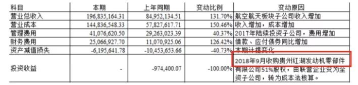 在公司2018年一季報中,公司在解釋投資收益變動原因時提到:“2018年9月收購貴州紅湖發(fā)動機有限公司51%股權(quán),由聯(lián)營企業(yè)變?yōu)槿Y子公司,轉(zhuǎn)為成本法核算”,以下為財報截圖: