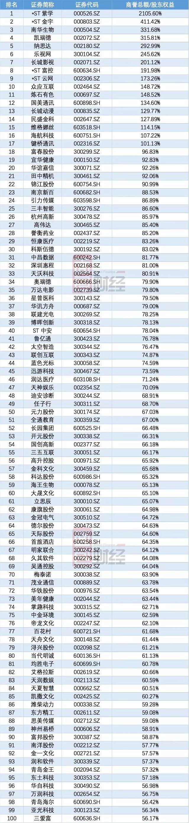 按照商譽占歸屬于母公司股東權益和資產總額占比,排名前100名如下: