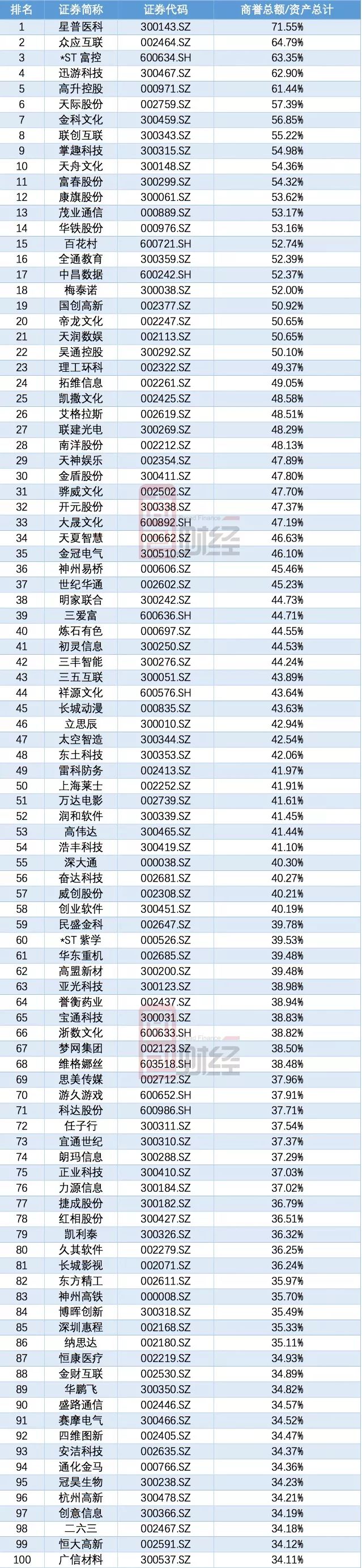 按商譽占資產總額比例排名: