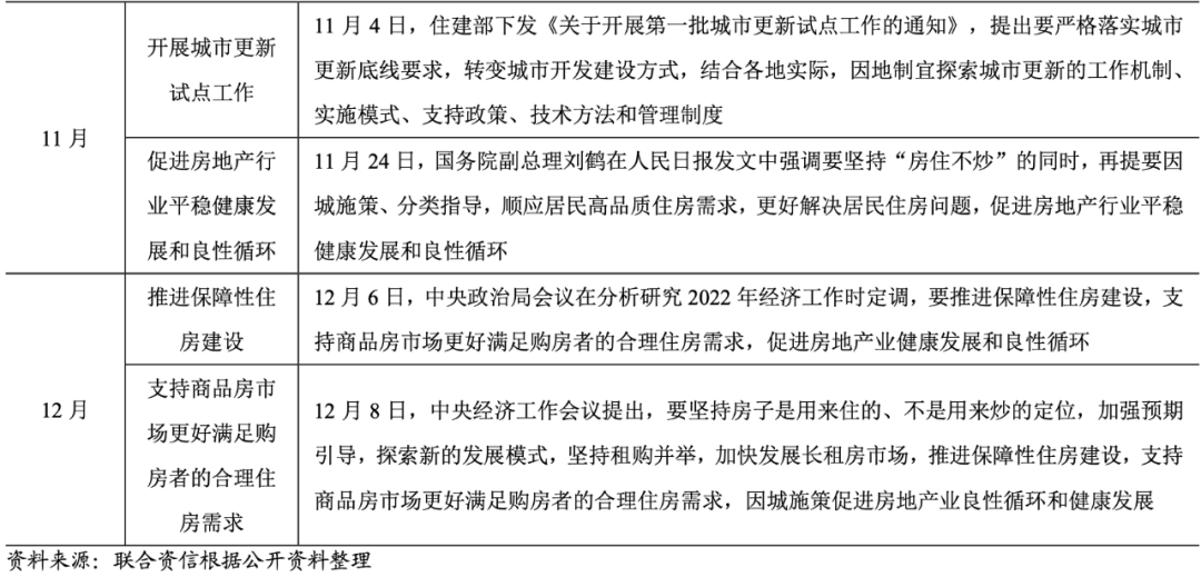 2021年作為“十四五”規(guī)劃的開局之年,房地產(chǎn)行業(yè)依舊延續(xù)“房住不炒、因城施策”的政策主基調(diào),政策持續(xù)高壓;9月底以來中央連續(xù)釋放樓市維穩(wěn)信號,房企結(jié)構(gòu)性寬信用小幅改善。展望2022年,房地產(chǎn)行業(yè)“嚴(yán)監(jiān)管”大方向不會(huì)改變,但行業(yè)信用風(fēng)險(xiǎn)事件頻出,且考慮到“保交付”政策指引,預(yù)計(jì)政策力度會(huì)有邊際改善。
