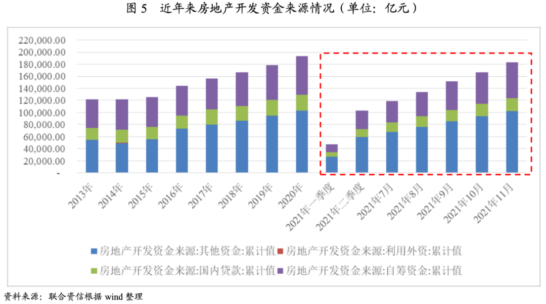 2021年,伴隨著防風(fēng)險(xiǎn)和調(diào)結(jié)構(gòu)的貨幣政策基調(diào),房地產(chǎn)行業(yè)融資明顯收緊。2021年1-11月,房地產(chǎn)開發(fā)企業(yè)到位資金合計(jì)18.34萬億元,同比增長7.17%;從單月看,7月開始,到位資金同比增幅開始轉(zhuǎn)負(fù),7-11月當(dāng)月降幅分別為-6.99%、-6.52%、-11.21%、-9.48%和-7.01%。9月底以來,金融管理部門及時(shí)對部分金融機(jī)構(gòu)過度收縮行為進(jìn)行適當(dāng)矯正,信貸環(huán)境邊際改善,房企融資壓力略有緩解。分類別看,其他資金(定金及預(yù)收款以及個(gè)人按揭貸款)和國內(nèi)貸款仍為房企到位資金的主要來源,下半年當(dāng)月到位資金的同比下降主要為其他資金和國內(nèi)貸款資金共同下降影響。