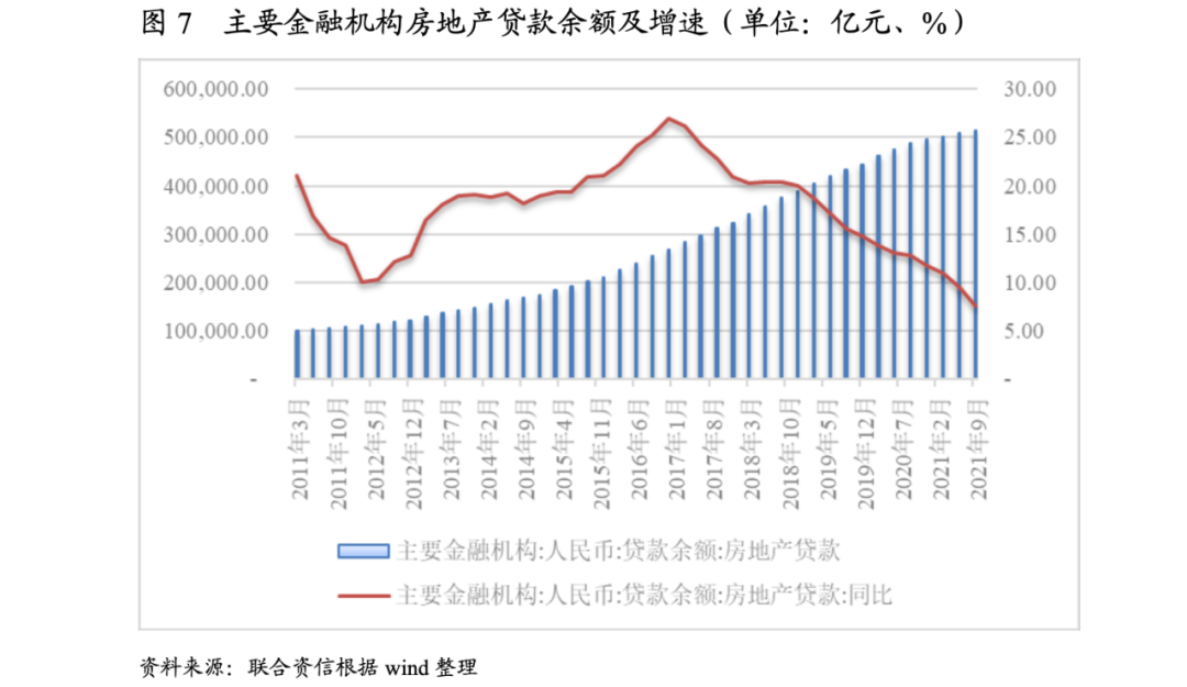 從房地產(chǎn)企業(yè)主要融資渠道銀行信貸來看,銀行信貸流向房地產(chǎn)領(lǐng)域的增速持續(xù)下降。截至2021年三季度末,國內(nèi)主要金融機(jī)構(gòu)房地產(chǎn)貸款余額為514000億元,同比增長7.6%,增速為2011年以來首次連續(xù)兩個(gè)季度低于兩位數(shù),增速創(chuàng)歷史新低。同時(shí)考慮到“房住不炒”的整體政策基調(diào)以及金融機(jī)構(gòu)房地產(chǎn)貸款集中管理制度的影響,預(yù)計(jì)主要金融機(jī)構(gòu)仍將壓降房地產(chǎn)貸款增速。