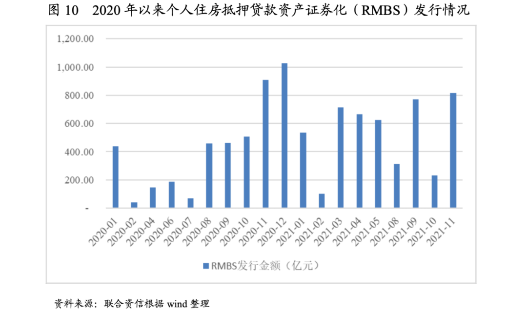 目前,結(jié)構(gòu)化產(chǎn)品融資已經(jīng)成為房企融資的重要方式,以個(gè)人住房抵押貸款資產(chǎn)證券化(RMBS)為例。2021年1-11月,國內(nèi)RMBS產(chǎn)品發(fā)行規(guī)模同比增長48.41%,但每月發(fā)行量波動(dòng)較大(6、7月零發(fā)行),結(jié)構(gòu)化產(chǎn)品融資受政策影響仍較大。