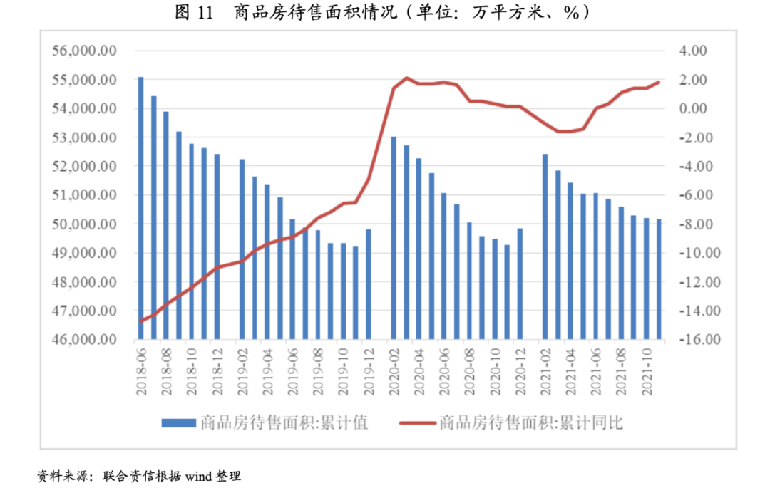 從商品房待售面積(竣工未售項(xiàng)目)看,2021年下半年,房地產(chǎn)行業(yè)市場景氣度持續(xù)下行,截至11月底,已竣工商品房庫存同比增速已上升至1.78%,待售面積規(guī)模為50165.00萬平方米。