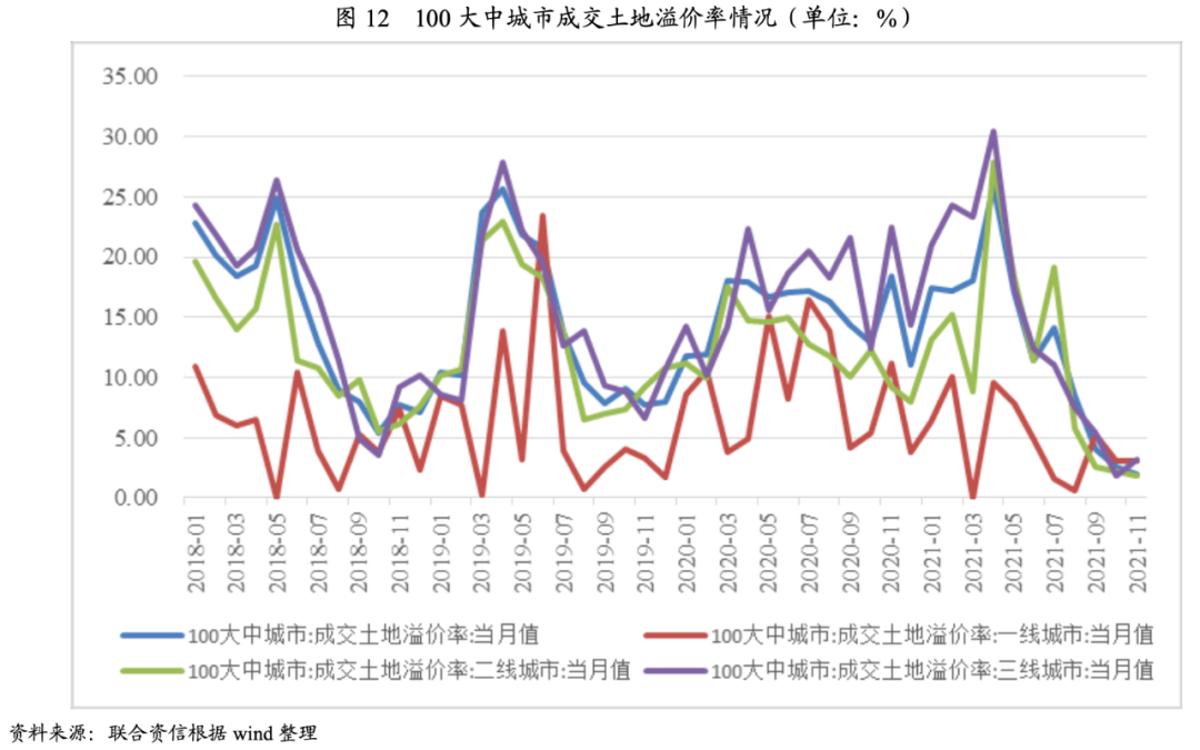 從土地成交溢價(jià)率看,一、二、三線城市的土地成交溢價(jià)率分化明顯。2021年以來,一線城市土地溢價(jià)率整體呈低位波動(dòng)態(tài)勢,振幅較小,開發(fā)商對一線城市的未來預(yù)期值仍較高。但隨著下半年政策趨嚴(yán)及市場遇冷,房企拿地意愿較差,二、三線城市土地溢價(jià)率急速下降,截至2021年11月底,二線城市溢價(jià)率已由年內(nèi)新高的27.86%下降至1.83%,三線城市溢價(jià)率已由年內(nèi)新高的30.41%下降至3.19%。