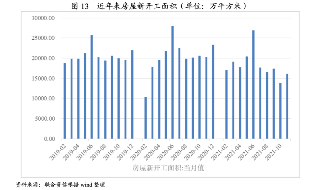 房企拿地成交量下降,行業(yè)新開工項(xiàng)目規(guī)模也同步下行。2021年1-11月,房企新開工面積規(guī)模為18.28億平方米,同比大幅下降9.08%,相較于2019年同期下降10.90%。分月份看,相較于2020年,除2-3月份受疫情因素影響,2021年其余月份新開工面積同比均有不同幅度下降,尤其是7-11月,降幅很大。