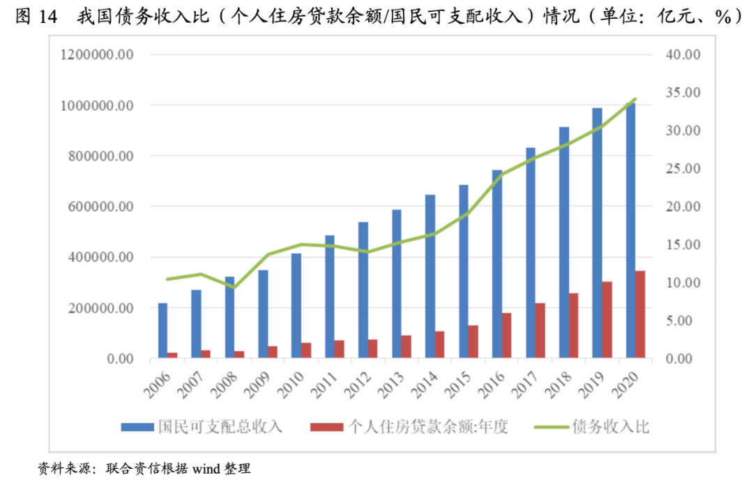 長期看,需求的硬上限為人口和購買力,我們使用居民貸款余額/可支配收入來衡量居民杠桿率水平;我國居民債務(wù)收入比總體呈增長態(tài)勢,尤其是2009年和2016年增速較快,主要受國家信貸政策放松影響。2020年,居民收入水平受疫情影響增速放緩,居民債務(wù)收入比(個(gè)人住房貸款余額/國民可支配收入)提升至34.18%。