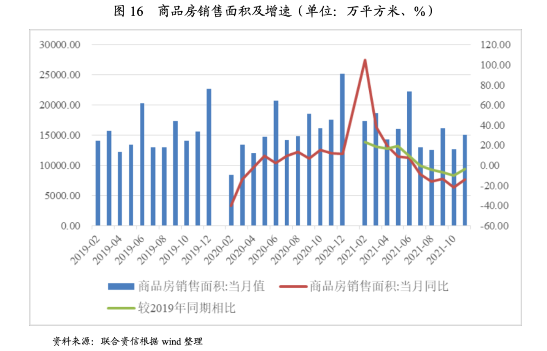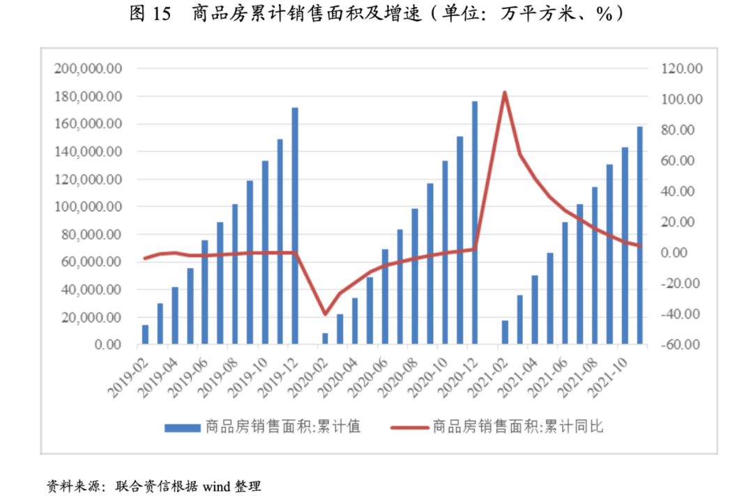 短期看,商品房的需求與貨幣政策及購房者的預(yù)期息息相關(guān)。2021年1-11月,行業(yè)商品房銷售面積同比增長4.80%至15.81萬平方米,商品房銷售額同比增長8.50%至16.17萬億元,但上下半年,國內(nèi)房地產(chǎn)銷售市場可謂冰火兩重天。2021年上半年,商品房銷售面積較2020年同期增長27.70%,較2019年同期增長16.96%;下半年,政府管控按揭力度,直接抑制了部分置換需求,此外房企為回籠資金促銷部分樓盤,樓盤價(jià)格下降壓低了購房者對未來的預(yù)期,商品房市場景氣度迅速回落,7-11月單月銷售面積環(huán)比增速分別為-8.54%、-15.55%、-13.17%、-21.65%和-13.97%。