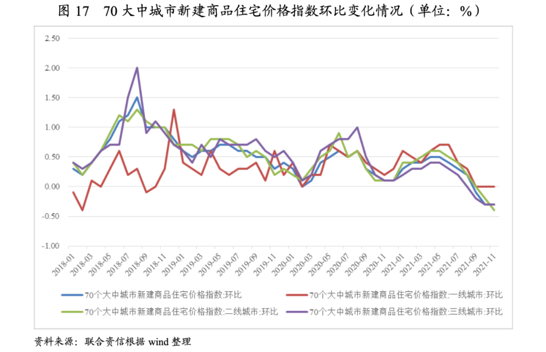 從30大中城市商品房成交數(shù)據(jù)看看,2021年1-11月,一線城市商品房成交面積同比增長19.15%,其中7-11月累計(jì)成交面積同比下降13.51%;二線城市商品房成交面積同比增長18.58%,其中7-11月累計(jì)成交面積同比下降10.99%;三線城市商品房成交面積同比下降11.92%,其中7-11月累計(jì)成交面積同比下降38.00%。可以看出,一線城市商品房成交在當(dāng)前市場環(huán)境下仍有一定韌性,三線城市受影響很大。