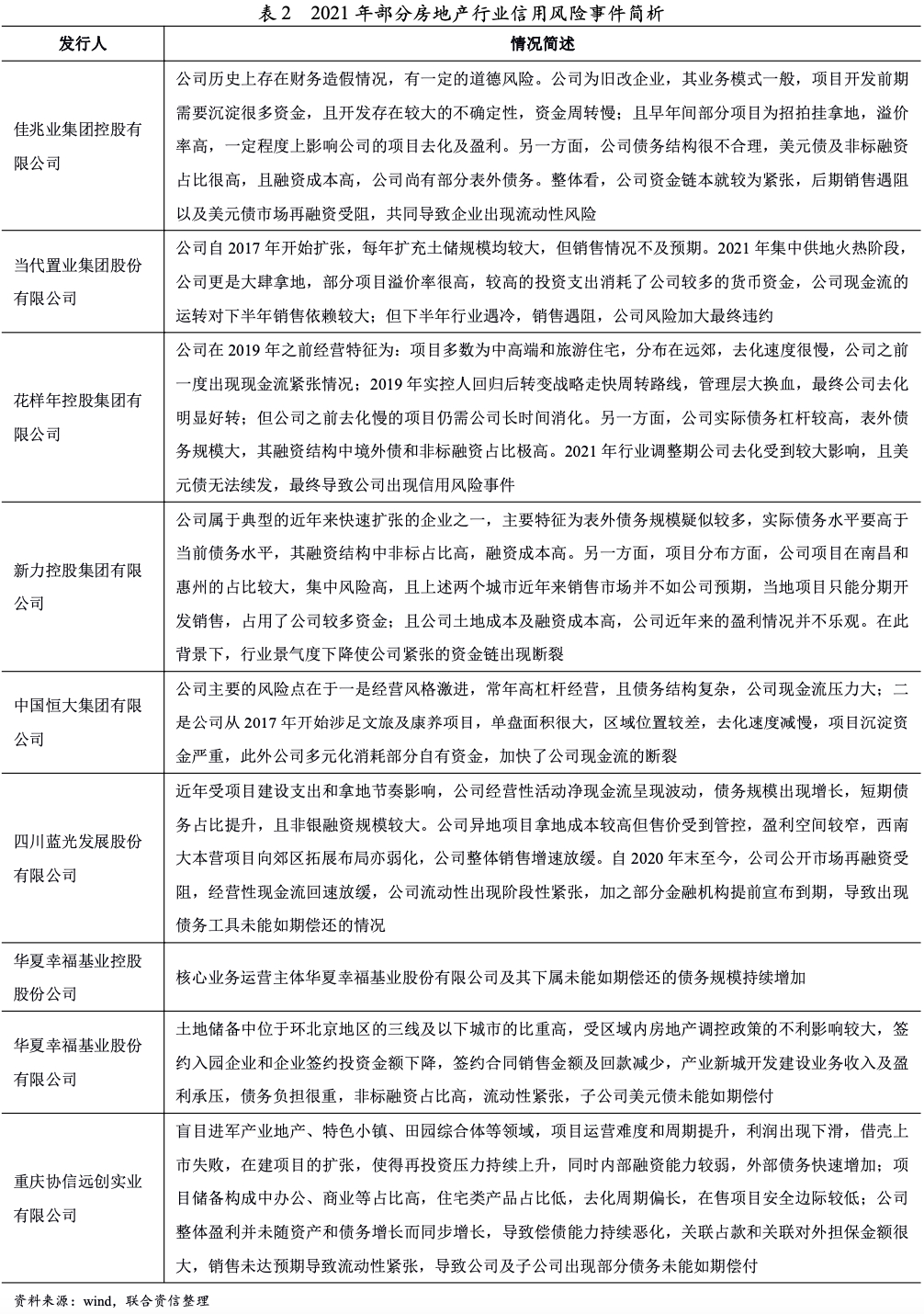 2021年以來,發(fā)生信用風(fēng)險(xiǎn)事件的部分房企主要呈現(xiàn)實(shí)際債務(wù)杠桿高,美元債和非標(biāo)融資占比高;項(xiàng)目質(zhì)地差,行業(yè)下行周期去化受影響更甚等特征,具體明細(xì)如下。